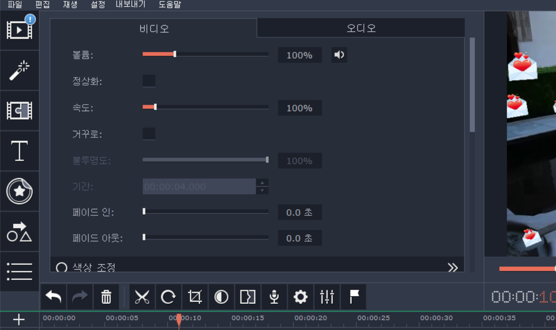 참고로 재생클립을 더블클릭하면 이렇게 비디오나 오디오 설정을 할 수 있게나옵니다.
