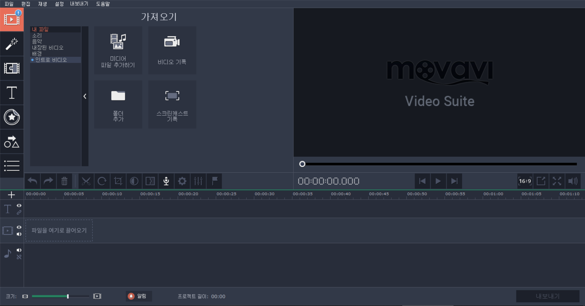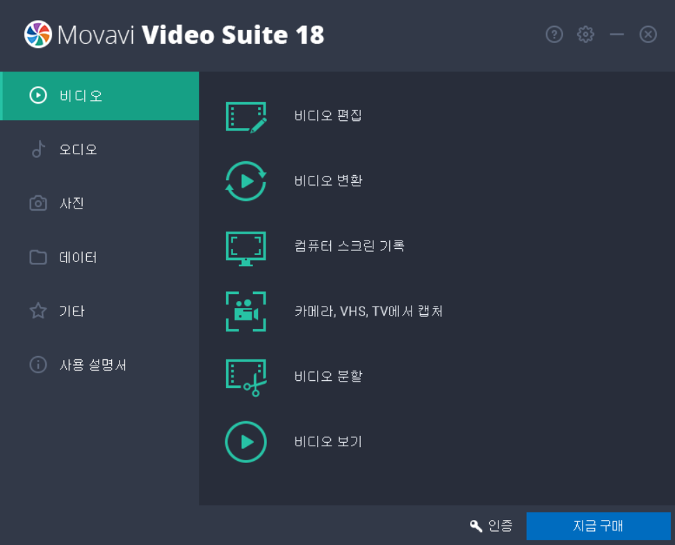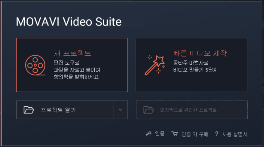 Movavi Video Suite 18을 다운받아서 설치하면 이러한 화면이 나옵니다. 구입하면 더 많은 기능을 쓸 수 있지만 무료로도 기본적인 영상 편집은 충분합니다.