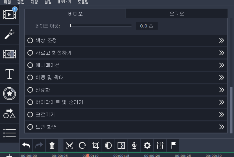 무료로 쓰는 것은 기능에 제한이 있지만 이정도로도 기본적인 영상 편집은 문제가 없을 것 같습니다. 프리미어프로는 효과(effect)에 대한 설명이 영어로만 되어 있어서 배우지 않으면 이게 어떤건지 당최 감을 잡을 수가 없는데 Movavi는 효과에 대한 설명이 그림으로 나오고 효과 적용 모습도 미리 알 수 있으니 영상 편집 초보자들의 입문 프로그램으로 딱 적