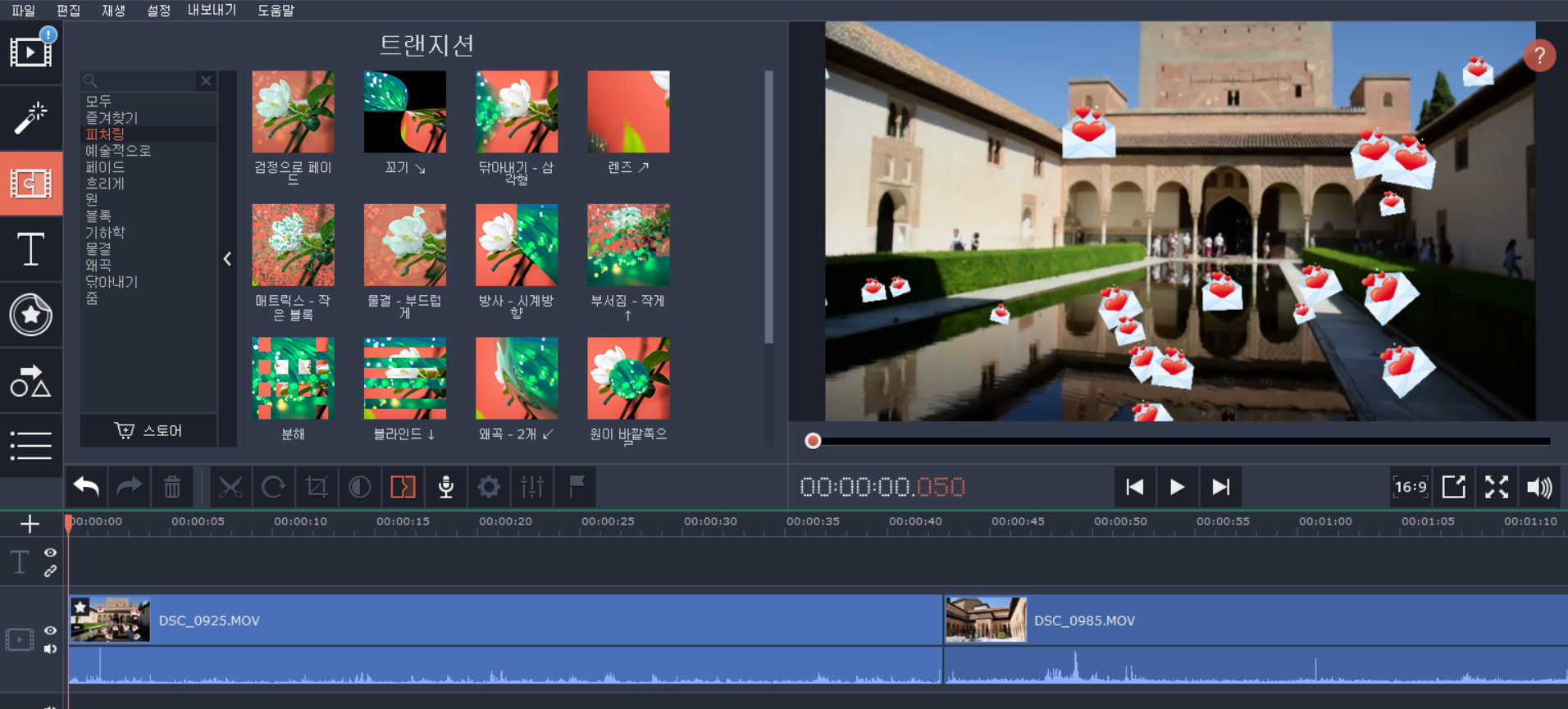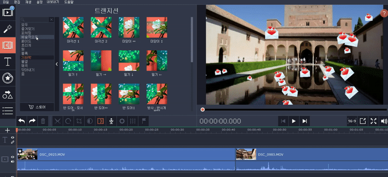 트랜지션은 클립과 클립을 합칠때 효과를 주는 것으로 역시 여러형태가 나와있어서 드래그 하는 것으로 쉽게 적용을 할 수 있습니다.