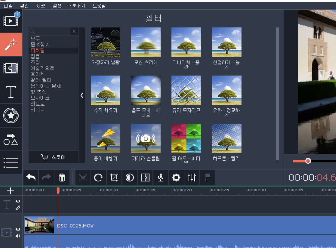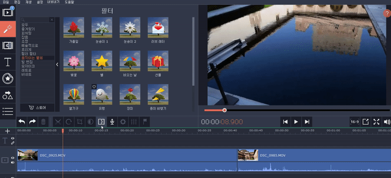 Movavi의 가장 큰 장점으로 여러가지 필터의 형상이 나와있으며 드래그하여 아래 편집화면에 넣으면 바로 효과가 적용됩니다.